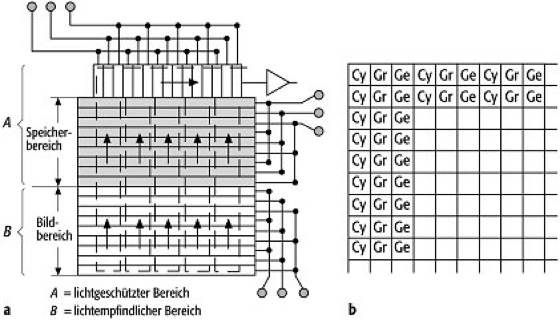 CCD-Sensor: Frame-Transfer-Sensor; a) Grundaufbau, b) Anordnung der Farbfilter. CCD-Sensor: