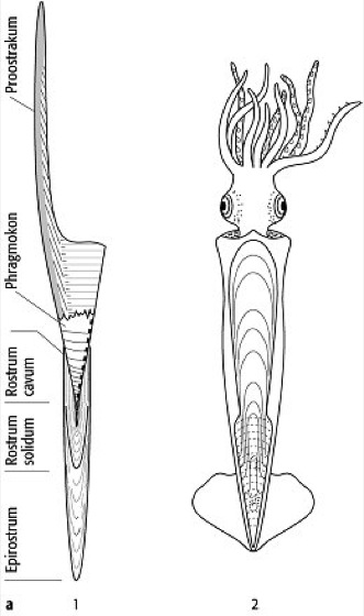 Cephalopoden 5a: schematischer Längsschnitt durch ein Belemnitengehäuse (1) und Rekonstruktionsversuch eines Belemniten (2). Cephalopoden 5a: