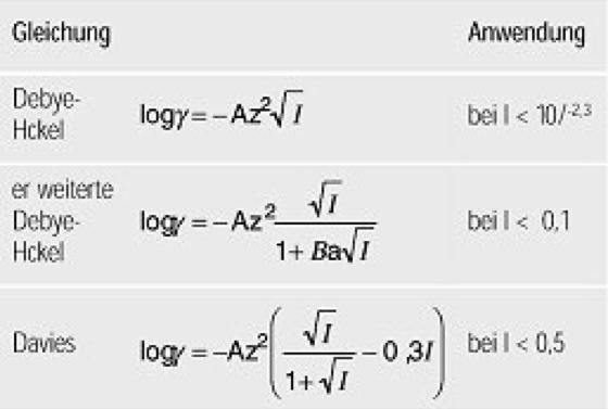 chemische Aktivität (Tab.): Berechnung des Aktivitätskoeffizienten korrespondierend zur Ionengröße (γ = Aktivitätskoeffizient; z = Ladung eines Ions; A = 1,82·106T)-3/2 (mit ε = Dielektrizitätskonstante), I = Ionenstärke; B = 50,3T)-1/2; a = Parameter [Å]). chemische Aktivität (Tab.):