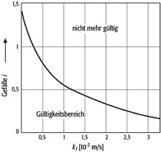 (Q in m3/s). Je feinkörniger der Boden, desto größer ist das Grenzgefälle i0. Die Bestimmung von i0 ist schwierig und hat bisher nur zu wenig zufriedenstellenden Ergebnissen geführt. Für Schluffe werden Grenzgefälle von i0 = 0,2-5 und für Tone i0 = 0-18 angegeben. Diese Streuung ist auf die physikalischen und chemischen Eigenschaften des Wassers und des Grundwasserleiters zurückzuführen.