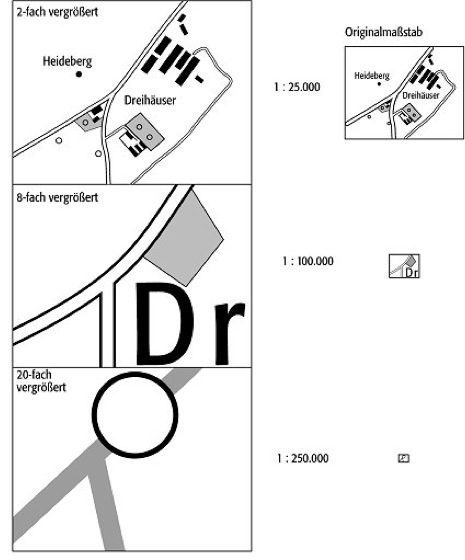 Darstellungsumschlag, Qualitätsumschlag, Generalisierungsmaßnahme, bei der die kartographische Darstellungsmethode gewechselt wird, um eine abstraktere Wiedergabe bei kleinerem Maßstab zu ermöglichen. Der Wechsel erfolgt von der flächenhaften zur Signaturdarstellung und/oder umgekehrt. Klassisches Beispiel ist der Übergang von der grundrißlichen Gebäudedarstellung zur Gebäudesignatur in großmaßstäblichen Karten, die im mittleren Maßstabsbereich abgelöst wird von der flächenhaften Darstellung der bebauten oder der Siedlungsfläche, an deren Stelle in den Übersichtsmaßstäben die Ortssignatur tritt ( Abb. ). Die für nicht scharf abgrenzbare Maßstabsbereiche typischen Darstellungsweisen werden auch als Darstellungsstufen bezeichnet.
