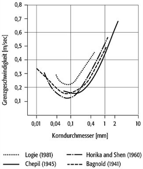 Deflation: Verhältnis von Korndurchmesser und Grenzgeschwindigkeit bei äolischem Transport. Deflation:
