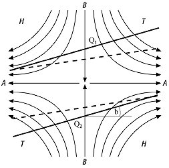 Deformationsfeld: Stromlinien eines hyperbolischen Deformationsfeldes mit zwei aufeinander folgenden Positionen der die eingelagerte Frontalzone begrenzenden Isentropen Θ1 und Θ2. A-A ist die Dehnungsachse, B-B ist die Schrumpfungsachse, H und T bezeichnen Hoch- bzw. Tiefdruckgebiet. Hier ist der Winkel β < 45º! Deformationsfeld: