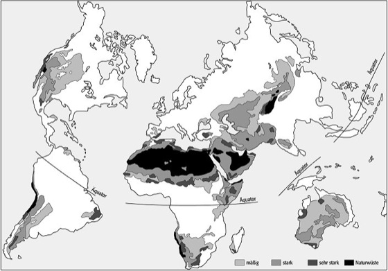 Desertifikation: Weltkarte der Wüsten und der von Desertifikation bedrohten Gebiete. Desertifikation: