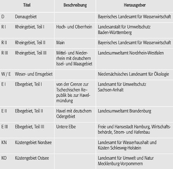 Deutsches Gewässerkundliches Jahrbuch, jährliche Veröffentlichung der Pegeldaten oberirdischer Fließgewässer, gemessen von den gewässerkundlichen Diensten des Bundes und der Länder (WSV). Das Deutsche Gewässerkundliche Jahrbuch ist nach den großen deutschen Flußgebieten unterteilt ( Tab. ) und liefert in tabellarischer Form Tageswerte, Hauptwerte, Dauerzahlen und Extremwerte der Wasserstände und Durchflüsse, zudem Grundwasserstände, Quellschüttungen, Wassertemperaturen und Schwebstoffmengen über einen Meßzeitraum von 14 Monaten (1. November bis 31. Dezember des Folgejahres). Neben einer knappen textlichen Erläuterung findet man meist auch graphische Darstellungen (z.B. hydrologische Längsschnitte) in dem Tabellenband. Das erste "Jahrbuch für die Gewässerkunde Nordeutschlands" erschien vom Abflußjahr 1901.