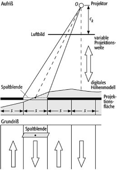 Differentialentzerrung, Verfahren der photogrammetrischen Bildauswertung zur optischen partiellen Transformation eines Bildes auf eine ausgezeichnete Ebene des Objektraumes unter Berücksichtigung der Höhen der Erdoberfläche mit Hilfe eines Differentialentzerrungsgerätes. Durch die Unterteilung in kleine Bildsegmente (Geraden) und die genäherte Eliminierung der durch die Geländehöhenunterschiede verursachten perspektivischen Verzerrungen in diesen Bildsegmenten wird eine Entzerrung von Luftbildern unebenen Geländes ermöglicht. Auf der Grundlage eines digitalen Höhenmodells wird die Geländeoberfläche i.d.R. streifenweise durch Sekantenscharen approximiert. Unter Beachtung der jeweiligen Höhen an den Streifenrändern erfolgt die Projektion des im Gerät orientierten Luftbildes partiell über einen lichtdurchlässigen Spalt, der streifenweise kontinuierlich gegenüber der Projektionsfläche mit dem photographischen Material bewegt wird. Das Ergebnis der Differentialentzerrung ist das einer genäherten Orthogonalprojektion entsprechende Orthophoto des abgebildeten Abschnittes der Geländeoberfläche ( Abb. ). geometrische Rektifizierung [KR]