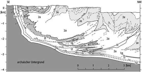 disharmonische Faltung: disharmonische Faltung zwischen gut geschichteter Basisfolge (1a-g) und massiven Sandsteinen (2e) wird ermöglicht durch eine mächtige Tonsteinfolge (2a); proterozoischer Faltengürtel, Mackenzie-Distrikt, Kanada. disharmonische Faltung: