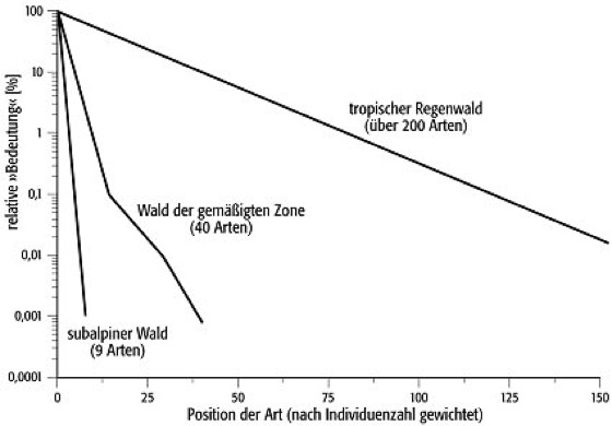 Dominanz: Dominanz-Diversitäts-Kurven drei verschiedenartiger Wälder. Dominanz:
