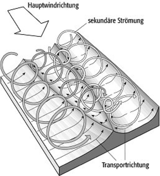 Draa: theoretisches Modell der Strömungs- und Transportrichtung bei der Entstehung von Draa durch gegenläufige, horizontale Wirbelrollen. Draa:
