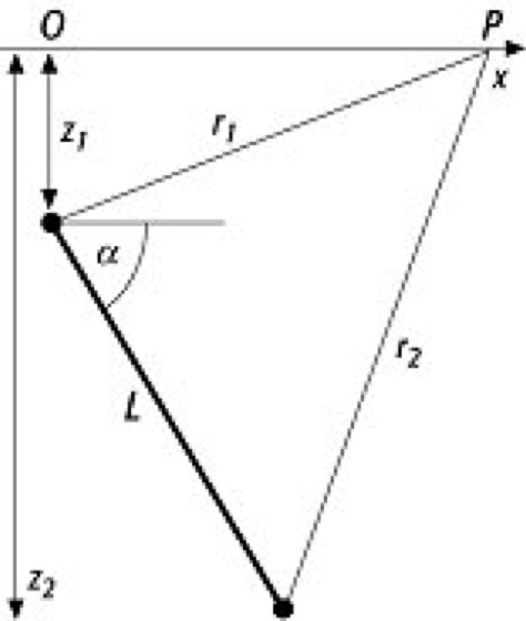 berechnet; r1 und r2 sind die Abstände der Stabenden zum Aufpunkt P an der Oberfläche ( Abb. 2 ). Mit a = Lcosα (L = Dipollänge, α = Neigungswinkel) folgt: