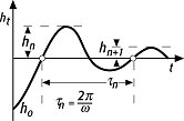 Einschwingverfahren 2: gedämpft harmonische Schwingung des Grundwasserspiegels um seine Ruhelage beim Einschwingversuch (ht = Amplitude zum Zeitpunkt t; h0 = Amplitude zum Zeitpunkt t = 0, ω = Eigenfrequenz, n = Anzahl der Perioden, τ = mittlere Schwingungsdauer).