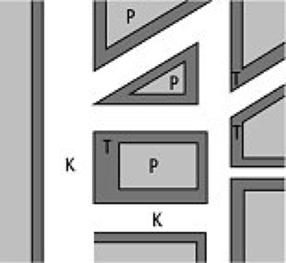 Eisen: schematische Darstellung der Struktur und des Mineralbestandes der oktaedritischen Eisenmeteoriten (K = Kamacit, T = Tänit, P = Plessit). Eisen: