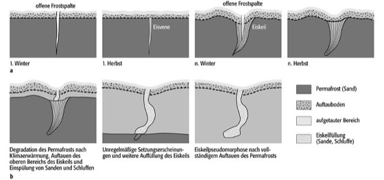 Eiskeil: schematische Darstellung der Entwicklung von Eiskeilen (a) und Eiskeilpseudomorphosen (b). Eiskeil: