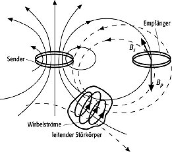 elektromagnetische Verfahren 2: Prinzip der elektromagnetischen Induktionsverfahren, hier dargestellt für ein Zweispulensystem. Bp ist das primäre, Bs das sekundäre Feld am Ort der Empfängerspule. elektromagnetische Verfahren 2:
