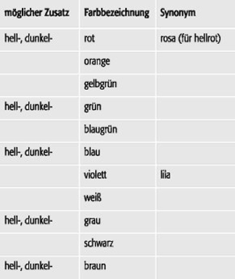 Farbbezeichnung (Tab.): umgangssprachliche Farbbezeichnungen. Farbbezeichnung (Tab.):