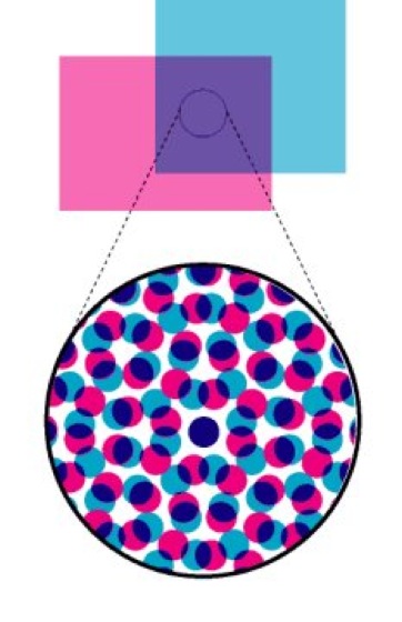 b) Die Mischfarben des Drei- und Vierfarbendrucks sowie in farbigen Tintenstrahl- und Laserausdrucken kommen ebenfalls auf subtraktivem Wege zustande. Das Übereinanderdrucken von zwei lasierenden (durchscheinenden) Druckfarben als Volltöne (d.h. ungerastert) führt zum gleichen Farbeindruck wie das Mischen dieser Farben nach der unter a) beschriebenen Technik. Die zahlreichen Farbnuancen im Vierfarbendruck entstehen durch Rasterung. Bereits auf dem Papier können sich Rasterpunkte überlappen ( Abb. 2 ). Zusätzlich überlagern sich im Auge – auflösungsbedingt – nebeneinanderliegende Rasterpunkte. Die auflösungsbedingte Farbmischung wird auch als optische Farbmischung bezeichnet. Für das Zusammenwirken beider bei Betrachtung von Vierfarbendrucken wirkenden Mischeffekte steht der Begriff autotypische Farbmischung.