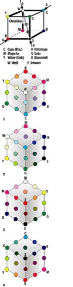 Farbwürfel: Farbwürfel in vier Perspektiven: 1 = subtraktive Perspektive (hellklare Farben), 2 = blaue Perspektive (kalte Farben), 3 = rote Perspektive (warme Farben), 4 = additive Perspektive (dunkelklare Farben). Farbwürfel: