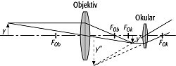 Fernrohr: Strahlenverlauf im astronomischen Fernrohr (y = betrachteter Gegenstand; y' = reeles, verkleinertes, umgekehrtes Bild des Gegenstandes; y'' = virtuelles, vergrößertes, umgekehrtes Bild des Gegenstandes; FOb = Brennpunkt des Objektivs; FOk = Brennpunkt des Okulars).
