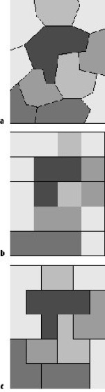 Flächenkartogramm: Darstellung des Anteils der bebauten Fläche als Flächenkartogramm auf der Basis von a) administrativen Einheiten (Gemeinden),b) eines Feldernetzes und c) von schematisierten Grenzen. Flächenkartogramm: