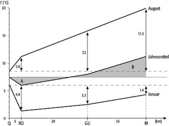 Fließgewässerabschnitt: Temperaturverhalten der Elz (Schwarzwald) von der Quelle bis zur Mündung für die Monate August und Januar sowie im Jahresmittel. Q = Quelle, RO= Station Rorhardsberg, GU = Gutach und RI = Riegel. Fließgewässerabschnitt: