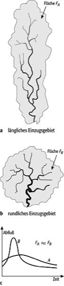 Flußkunde: Beziehung zwischen der Form eines Einzugsgebietes und dem Abflußgang (Prinzipskizze). Flußkunde: