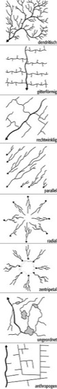 Flußnetz, räumliches Muster, das von Gewässerläufen verschiedener Größenordnung innerhalb eines bestimmten Ausschnittes der Erdoberfläche gebildet wird. In Abhängigkeit vom Niederschlagsangebot, den morphologischen Verhältnissen sowie der geologischen Beschaffenheit des Untergrundes kann ein Flußnetz verschiedene Muster annehmen, die innerhalb eines größeren Flußgebietes gewöhnlich mehrfach wechseln. Daher setzen sich natürliche Flußnetze meist aus einer Kombination verschiedener Flußnetztypen zusammen ( Abb. ). Darüber hinaus kann ein Flußnetz auch durch anthropogene Eingriffe und wasserbauliche Maßnahmen verändert sein. Werden Trockentäler in eine solche Betrachtung einbezogen, gilt analog der Begriff Talnetz.