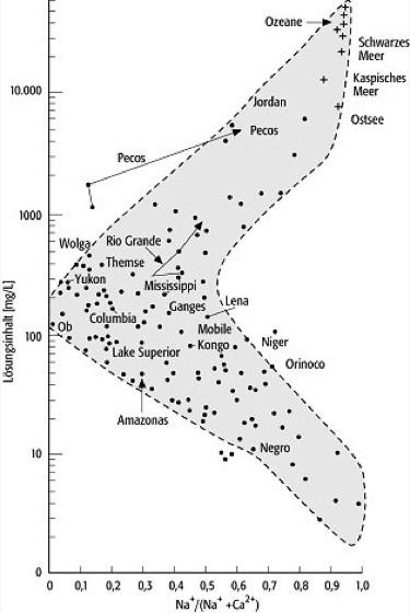 Flußwasser-Inhaltsstoffe: Einflußfaktoren der Zusammensetzung von Flußwässern, dargestellt am Gewichtsverhältnis Na+/(Na++Ca2+) zum gelösten Stoffinhalt (Kreise = Seen und Flüsse, Kreuze = Ozeane). Flußwasser-Inhaltsstoffe: