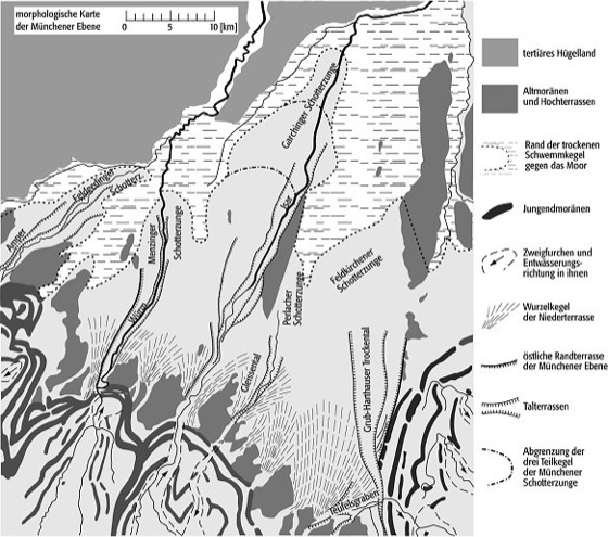 fluvioglaziale Schotter: Würmkaltzeitliche Schotterfelder der Münchener Ebene, mit Schwemmkegeln und Trompetentälchen. fluvioglaziale Schotter: