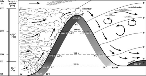 Föhn: schematische Darstellung des Föhns (RF = relative Feuchte). Föhn: