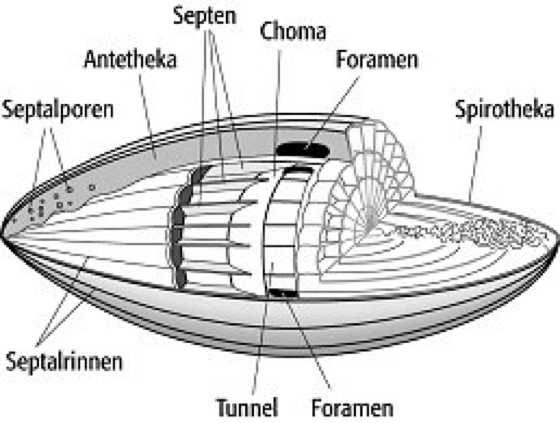 Foraminiferen, Foraminiferida, Kammerlinge, eine Klasse der Rhizopoda (Wurzelfüßer) und daher verwandt mit den Actinopoda (hier v.a. Radiolarien). Es handelt sich dabei um eine Gruppe formenreicher, heterotropher, überwiegend mariner Einzeller ( Abb. 1 ). Foraminiferen sind schalentragende Amöben, die mit ihren Nahrungsvakuolen direkte Phagocytose ausführen können. Das Cytoplasma ist von einem Außenskelett umgeben. Dieses kann einkammerig (monothalam) oder mehrkammerig (polythalam) ausgebildet sein und besteht aus organischer Grundsubstanz (Tektin) mit eingelagerten Calciumverbindungen (hauptsächlich Calcit, selten Aragonit), Fremdkörpern, kleinen Steinen oder Silicaten. Kalkgehäuse variieren in ihrer Feinstruktur. Durch eine größere Öffnung und feine Poren können Pseudopodien herausgestreckt werden. Das Ektoplasma umfließt von der Mündung ausgehend das Gehäuse und kann zwischen 0,05 und 150 mm groß sein. Bei den mehrkammerigen Gehäusen sind die Kammern durch Septen getrennt. Die Verbindung der Septen mit der Gehäusewand läßt sich meist als Sutur erkennen. Die Anfangskammer wird als Proloculus bezeichnet. Eingerollte Gehäuse der Foraminiferen heißen advolut, wenn sich die Umgänge entlang einer Linie berühren, evolut, wenn sich die Umgänge entlang einer Fläche berühren, involut, wenn die jüngeren Umgänge nur teilweise die älteren umgreifen, und convolut, wenn die Umgänge ganz umfaßt werden.