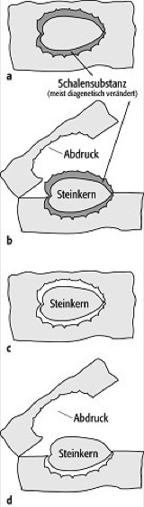 Die Lösung erfolgt selektiv, d.h. manche Organismenreste bleiben erhalten, während andere verschwinden. Ein Beispiel ist die Periost-Erhaltung bei Mollusken bzw. die Sipho-Erhaltung bei Ammoniten: Während die carbonatischen Anteile in dunklen, bituminösen Sedimenten häufig in Lösung gehen, bleibt das Periostracum bzw. der organische Siphostrang erhalten. Solche Fossilien sind oft völlig verdrückt und wirken schemenhaft. Sehr häufig sind stoffliche Veränderungen durch molekulare Umsetzungen. Erfolgen diese ohne Veränderung des Stoffbestandes, so nennt man sie isochemisch. Die Umwandlung instabiler Mineralmodifikationen in stabile (z.B. Aragonit-Calcit-Transformation) gehört dazu ebenso wie die Sammelkristallisation (Wachstum größerer auf Kosten kleinerer, aufgelöster Kristalle) oder die frühdiagenetisch einsetzende Mikritisierung. Allochemische molekulare Umsetzungen (Stoffaustausch, Metasomatose) gehen auf die Einwirkungen chemisch abweichender Porenwasserlösungen zurück. Sehr häufig sind Verkieselung (Austausch der ursprünglichen Substanz gegen SiO2) und Verkiesung (Austausch gegen Metallsulfide, z.B. Pyrit = Pyritisierung). Bei der Dolomitisierung werden Mg-Ionen in das Carbonatgitter eingebaut. Eine damit verbundene Volumenänderung sowie der Umstand, daß dabei das umgebende Carbonatgestein gleichermaßen betroffen ist, wirken sich negativ auf die Bestimmbarkeit dolomitisierter Reste aus. Zirkulierende Porenwässer können über einen reinen Stoffaustausch hinaus poröse Organismenreste isochemisch oder allochemisch mit Fremdionen anfüllen (Imprägnation), beispielsweise spongiöse Wirbeltierknochen. Hohlräume in Schalen oder Gehäusen werden normalerweise nach Verwesung des Weichkörpers rasch mit feinkörnigem Sediment ausgefüllt, wenn solches Material durch irgendwelche Öffnungen eindringen kann. Ist das nicht der Fall, so bleibt der Hohlraum bestehen, bis er dem zunehmenden Druck des in Kompaktion befindlichen Gesteins nicht mehr standhalten kann und kollabiert. Aus diesem Grund sind die hinter der Wohnkammer liegenden Kammern von Cephalopoda häufig flachgedrückt, während die Wohnkammer mit Sediment gefüllt und daher vollständig erhalten ist. Die Innenausfüllungen solcher Hohlräume nennt man Steinkerne ( Abb. 1c, 1d ). Sie bilden für gewöhnlich die Innenmerkmale einer Schale/eines Gehäuses gut ab, v.a. wenn sie aus sehr feinkörnigem Material bestehen. Unvollständig ausgefüllte Hohlräume, die sog. fossilen Wasserwaagen, sind wichtige Geopetalgefüge. Als Fossilabdruck ( Abb. 1b ) wird bezeichnet, was die Gehäuseaußenseite im umgebenden Gestein hinterläßt. Selbst nach völliger Auflösung läßt sich die Form der Hartteile bei Vorhandensein guter Steinkern- und Abdruckfossilien vollständig rekonstruieren. Bei dünnschaligen Organismen bzw. an dünnen Außenrändern von Schalen kommt es manchmal zu einer Überprägung der Innenmerkmale am Steinkern durch Skulpturmerkmale der Außenseite (Skulptursteinkern, Prägekern).