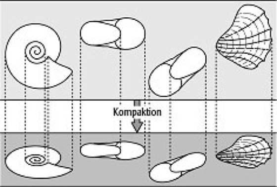 Im Verlauf der Gesteinsdiagenese erfolgt durch Entwässerung des Sediments und gleichzeitig steigender Auflast eine Kompaktion. Dadurch verlieren die eingeschlossenen Fossilien ihre ursprüngliche Form, sie werden je nach Einbettungslage flachgedrückt bzw. gestaucht ( Abb. 2 ). Infolge tektonischer Bewegungen erfolgen Verzerrungen. Die dabei erzeugten Formveränderungen lassen auf die Richtung des tektonischen Stresses rückschließen. [MG]