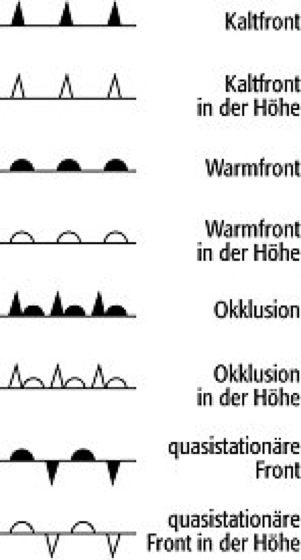 Frontensymbole, Zeichen zur Darstellung und Unterscheidung der Fronten auf der Wetterkarte ( Abb. ).