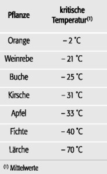Frostschaden (Tab.): Frostresisitenz einiger Pflanzenarten außerhalb der Vegetationsperiode. Frostschaden (Tab.):