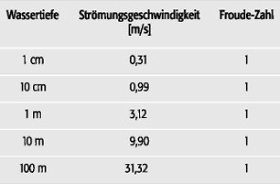 Froude-Zahl (Tab.): Beziehungen zwischen Wassertiefe, Strömungsgeschwindigkeit und Froude-Zahl. Froude-Zahl (Tab.):