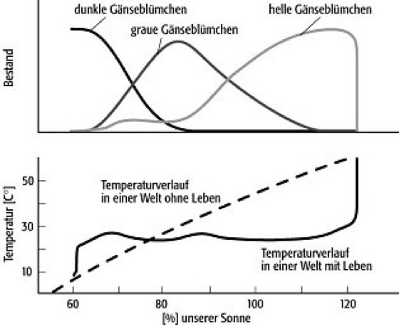 Gaia-Theorie: die Entwicklung des Klimas auf einer Daisyworld mit drei Arten (dunkle, graue und weiße Gänseblümchen). Die gestrichelte Linie im unteren Diagramm zeigt zum Vergleich den Temperaturverlauf in einer Welt ohne Leben. Gaia-Theorie: