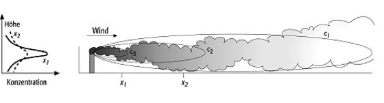 Gauß-Modell: Abgasfahne und Darstellung durch das Gauß-Modell. Vertikalprofile der Konzentration einer Luftbeimengung in Quellnähe (x1) und in weiterer Quellentfernung (x2). Gauß-Modell: