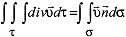 Gaußscher Integralsatz, Gaußscher Satz, Integralsatz von Gauß-Ostrogradski, Spezialfall des allgemeinen Stokesschen Satzes. Dabei ist τ ein geschlossenes, beschränktes Gebiet im dreidimensionalen euklidischen Raum, σ der Rand von τ,