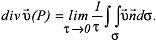 = 0, so verschwindet das Flächenintegral, es fließt durch σ keine Masse ab. Aus dem Gaußschen Integralsatz erhält man eine koordinatenfreie Darstellung der Divergenz, also der Quelldichte im Punkt P, indem das Gebiet τ, indem P liegt, auf P zusammengezogen wird:
