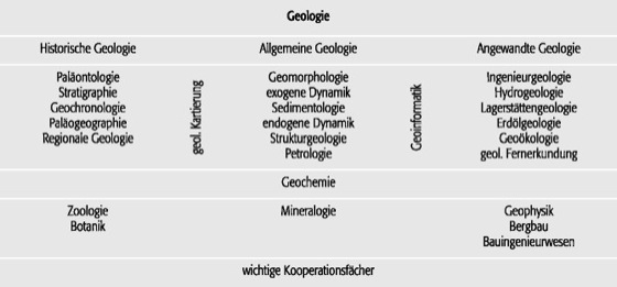 Mit Lyell ist das sog. Heroische Zeitalter der Geologie abgeschlossen und es erfolgt der Ausbau des Faches in Verbindung mit der Einrichtung von universitären Lehrstühlen und Geologischen Landesanstalten sowie mit Gründungen der geologischen Gesellschaften. Im Vordergrund stand die Landesaufnahme mit der Erstellung geologischer Karten, die Beschreibung und taxonomische Ordnung der fossilen Faunen und Floren und eine detaillierte stratigraphische Gliederung der Erdgeschichte. Starke Anregungen lieferten die naturwissenschaftlich/geologisch orientierten Reisen von A.v. Humboldt (1769-1859) und L.v. Buch (1774-1852). Im Bereich der Paläontologie gelang G. Cuvier (1769-1832) durch vergleichend anatomische Untersuchungen eine Gliederung der fossilen Fauna, und Ch. Darwin (1809-1882) entwickelte seine Deszendenzlehre, die heute als Grundkonzeption aller biologischen Wissenschaften gilt. Die wachsenden Anforderungen der Industriegesellschaft im 20. Jh. führten zu starken Spezialisierungen der geologischen Wissenschaften, die heute eine Gliederung in drei Großbereiche aufweisen ( Tab. ):