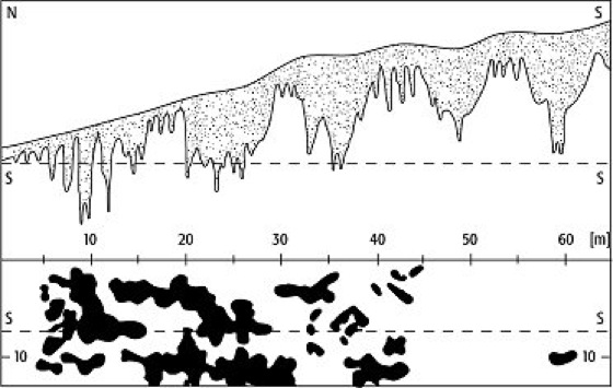 geologische Orgel: geologische Orgel im bedeckten Karst; oberer Bildteil: grau = boden- und sedimenterfüllte Karstspalten, weiß = geologische Orgel aus Gipsgestein; unterer Bildteil: horizontaler Schnitt durch das obere Porfil entlang der gestrichelten Schnittlinie(S-S). Die lehmerfüllten Karstschlotten sind schwarz dargestellt. geologische Orgel: