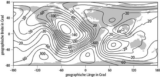 geomagnetische Säkularvariation 1: Linien gleicher zeitlicher Änderungen der vertikalen Komponente des Erdmagnetfeldes in nT/Jahr für 1990. geomagnetische Säkularvariation 1: