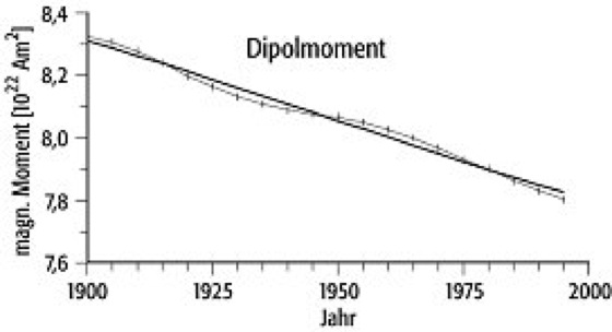 geomagnetische Säkularvariation 2: Abnahme des magnetischen Dipolmoments der Erde von 1900 bis 1995 mit linearer Interpolation. geomagnetische Säkularvariation 2: