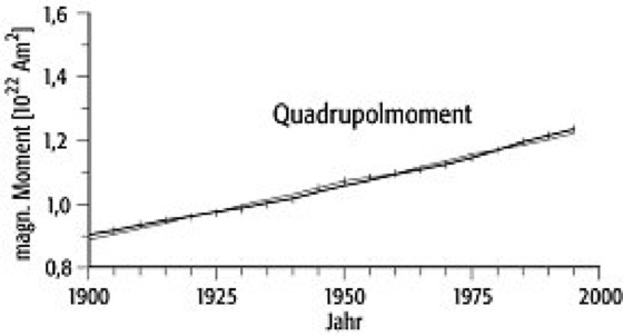 geomagnetische Säkularvariation 3: Zunahme des deutlich schwächeren magnetischen Quadrupolmoments von 1900 bis 1995 mit linearer Interpolation. geomagnetische Säkularvariation 3: