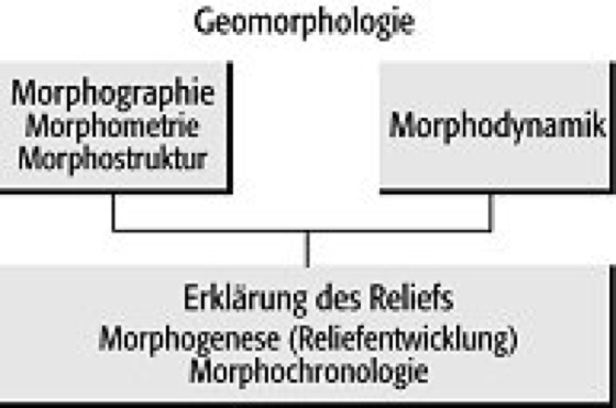 Geomorphologie, Lehre von den Oberflächenformen der Erde (Relief), mit deren exakter qualitativer (Geomorphostruktur) und quantitativer Beschreibung (Geomorphometrie), deren Klassifizierung, der Erklärung der Formungsvorgänge (Geomorphodynamik) und der Formenentwicklung (Geomorphogenese) sowie der Erarbeitung der zeitlichen Stellung der Formen (Geomorphochronologie) ( Abb. ). Da die genetisch, funktional und räumlich zu untersuchenden Objekte der Geomorphologie im Überschneidungsbereich von Teilsphären der Geosphäre verortet sind (Lithosphäre, Atmosphäre, Hydrosphäre, Pedosphäre, Biosphäre, Anthroposystem), ergibt sich ein starker methodischer und inhaltlicher Bezug zu den Nachbarwissenschaften (Geologie, Klimatologie, Meteorologie, Hydrologie, Bodenkunde, Landschaftsökologie), was der Geomorphologie einen generell interdisziplinären Charakter verleiht. Institutionell ist die Geomorphologie meistens in der Physischen Geographie verankert und stellt dort einen der zentralen Schwerpunkte dar. Der Begriff Geomorphologie wird im innerdisziplinären Sprachgebrauch oft verkürzt (Morphologie, Morphostruktur), in der Praxis findet man häufig auch eine weiterführende Differenzierung nach der dominierenden Einflußgrößen der Formung (Strukturgeomorphologie), nach Prozeßbereichen (Fluvialmorphologie, Karstmorphologie, Glazialmorphologie, Küstenmorphologie), nach dem vertretenen Interpretationsansatz (klimagenetische Geomorphologie) oder bezugnehmend auf das Forschungsziel (allgemeine, historisch-geomorphogenetische, quantitative, qualitative, theoretische und Angewandte Geomorphologie). Wissenschaftshistorisch entwickelte sich die Geomorphologie in der letzten Hälfte des 19. Jh. zunächst als Ableger der Geologie, wobei geomorphologische Aspekte nur im Zusammenhang mit den Erklärungsversuchen der Gesteinsentstehung (Neptunismus, Plutonismus, Vulkanismus) betrachtet wurden. Insbesondere die zunehmende Anwendung des Aktualismus basierte auf der Beobachtung der gesteinsbildenden und gleichermaßen landschaftsverändernden Prozesse und der resultierenden Landformen (K. Hoff, C. Lyell). Dadurch rückten die Formen und die sie schaffenden Prozesse mehr und mehr in das Interesse der erdwissenschaftlichen Forschung. Im folgenden erwuchs eine eigenständige Forschungsrichtung, mit der erstmaligen Erwähnung des Begriffs "Morphologie" 1850 durch C.F. Naumann, dann 1894 in A. Pencks Lehrbuch "Morphologie der Erdoberfläche". Die Grundlagen der Physischen Geographie und damit auch der Geomorphologie wurden von meist betont geologisch vorgebildeten Geographen (F. Richthofen, A. Penck) geschaffen, welche sich, gemäß der damaligen allgemeinen Methodologie der Naturwissenschaften, eines streng positivistisch-materialistischen Forschungsansatzes bedienten. Wie jede Wissenschaftsdisziplin unterliegt die Geomorphologie einer der eigenen Tradition historisch verhafteten Entwicklung, in der sich Inhalte, Techniken, Fachsprache und Theoriebildung etablieren, Gegenentwürfe provozieren und abgelöst werden. Maßgebliche historische Forschungsansätze (z.B. Zyklentheorie, Klimageomorphologie) sind eng mit den Namen der sie vertretenden akademischen Lehrer verbunden (W.M. Davis, W. Penck, J. Büdel).