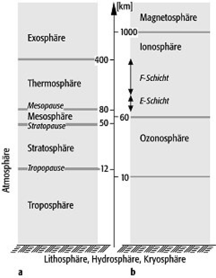 Geosphäre: Vertikalgliederung der Atmosphäre nach Temperaturschichtung (a) und nach geladenen Teilchen (b). Geosphäre: