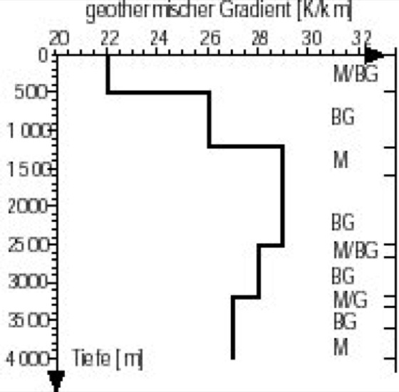 geothermischer Gradient: geothermischer Gradient in der KTB-Vorbohrung (M = Metabasite, BG = Biotit-Sillimanit-Gneise, G = Gneise). geothermischer Gradient: