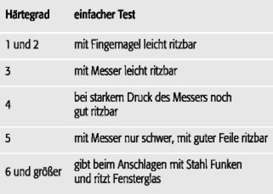 Die Intervalle zwischen den einzelnen Härtegraden dieser Skala sind ungleich; z.B. ist der Abstand zwischen den Härten 3, 4 und 5 sehr gering, der zwischen Härte 9 und 10 jedoch größer als der zwischen 1 und 9. Nach DIN 4022, Teil 1, wird die Mineralkornhärte bei voll- und teilkörnigem Gestein an möglichst großen Einzelkörnern durchgeführt. Bei nichtkörnigen Gesteinen kann sie auch an Probeflächen vorgenommen werden ( Tab. ). Härte.