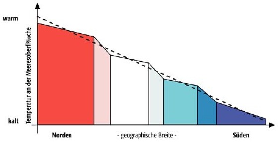 Gewässer-Front: schematische Darstellung des Temperaturverlaufs durch eine Serie von Frontalzonen wie sie z.B. im Antarktischen Zirkumpolarstrom auftreten. Gewässer-Front:
