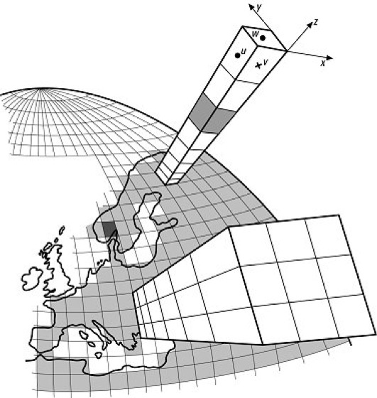 Gitterpunktsystem, Rechengitter, auf dem Simulationen mit numerischen Modellen durchgeführt werden ( Abb. ). Bei den numerischen Simulationen wird meistens das Rechengebiet mit einem Netz überzogen, an dessen Knotenpunkten die meteorologischen Variablen definiert und mit dem zugrundeliegenden Gleichungssystem berechnet werden. Der horizontale Abstand Δx und Δy zwischen zwei Knoten ist die Gitterweite, die bei Klimamodellen 100-500 km beträgt, bei Wettervorhersagemodellen 5-50 km und bei Modellen für die Mikro- und die Mesoskala 10 m-5 km. Während diese horizontalen Abstände ausreichen, um die auf der entsprechenden Skala relevanten meteorologischen Vorgänge darzustellen und zu berechnen, müssen in der vertikalen Richtung die Knotenpunkte dichter beisammen liegen. Typische Abstände Δz in Erdbodennähe sind dabei 5-50 m und im Bereich der planetaren Grenzschicht 100-400 m. Aus Gründen, die mit der mathematischen Lösung des verwendeten Gleichungssystems zu tun haben, wird häufig nicht nur ein Gitterpunktsystem benutzt, sondern zwei gegeneinander um eine halbe Maschenweite verschobene Gitter. Dabei werden die Geschwindigkeitskomponenten u, v und w in die drei Raumrichtungen x, y und z auf eine bestimmte Art um einen zentralen Knotenpunkt angeordnet, an dem die anderen meteorologischen Variablen (z.B. der Luftdruck p) definiert sind. [GG]